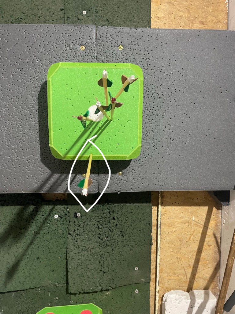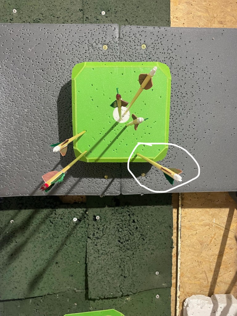 Then…I hit the little screw below the foam dice target. Now, my arrow didn’t break from the hit. It made a loud noise but it didn’t break. So that means I can use it again, right?